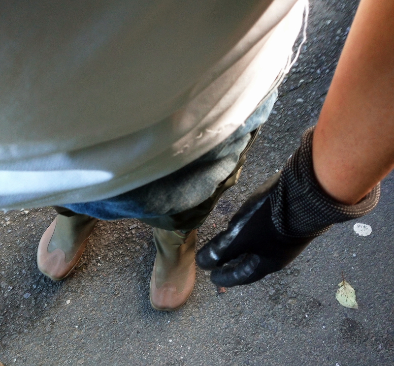 6パックならぬ、3段腹を俯瞰で見る・・・バカ長、手袋&虫よけスプレー装備。