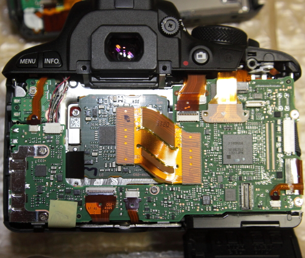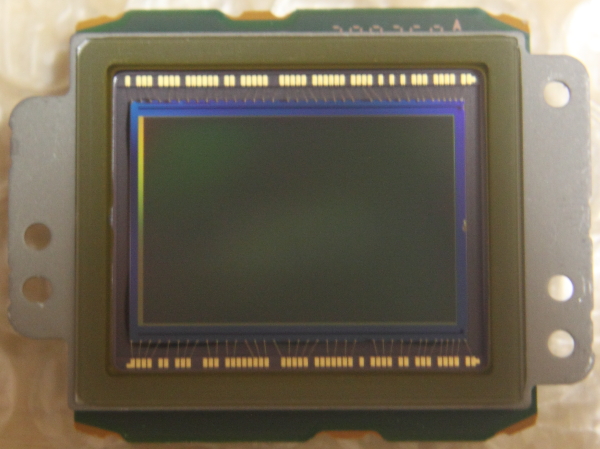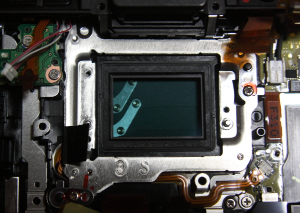 中央の四角い基盤(緑)の裏がCMOS素子、3個のネジでフレームに固定されている。