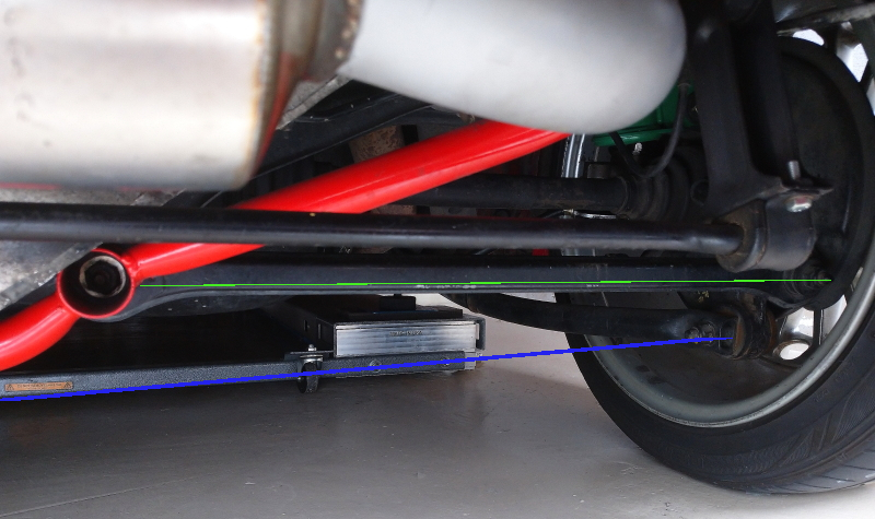 リヤ側を見る・・・緑のライン(アームとデフ間)、青のライン(リンク→ホイール間)を