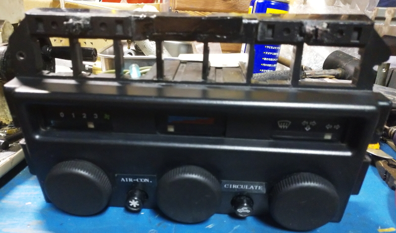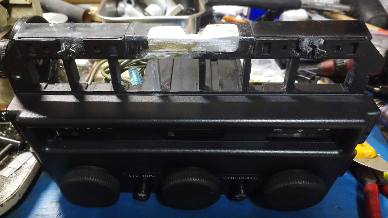 写真、中央上の銀色部分が修復箇所でフォグ等のスイッチが収まるセパレーターと固定柱、