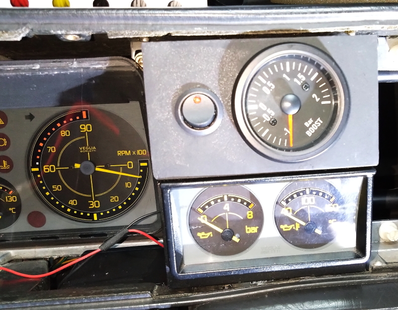 で、ブースト計設置・・・前と同じ化粧板も裏を補強後、艶消し黒で塗り直した。